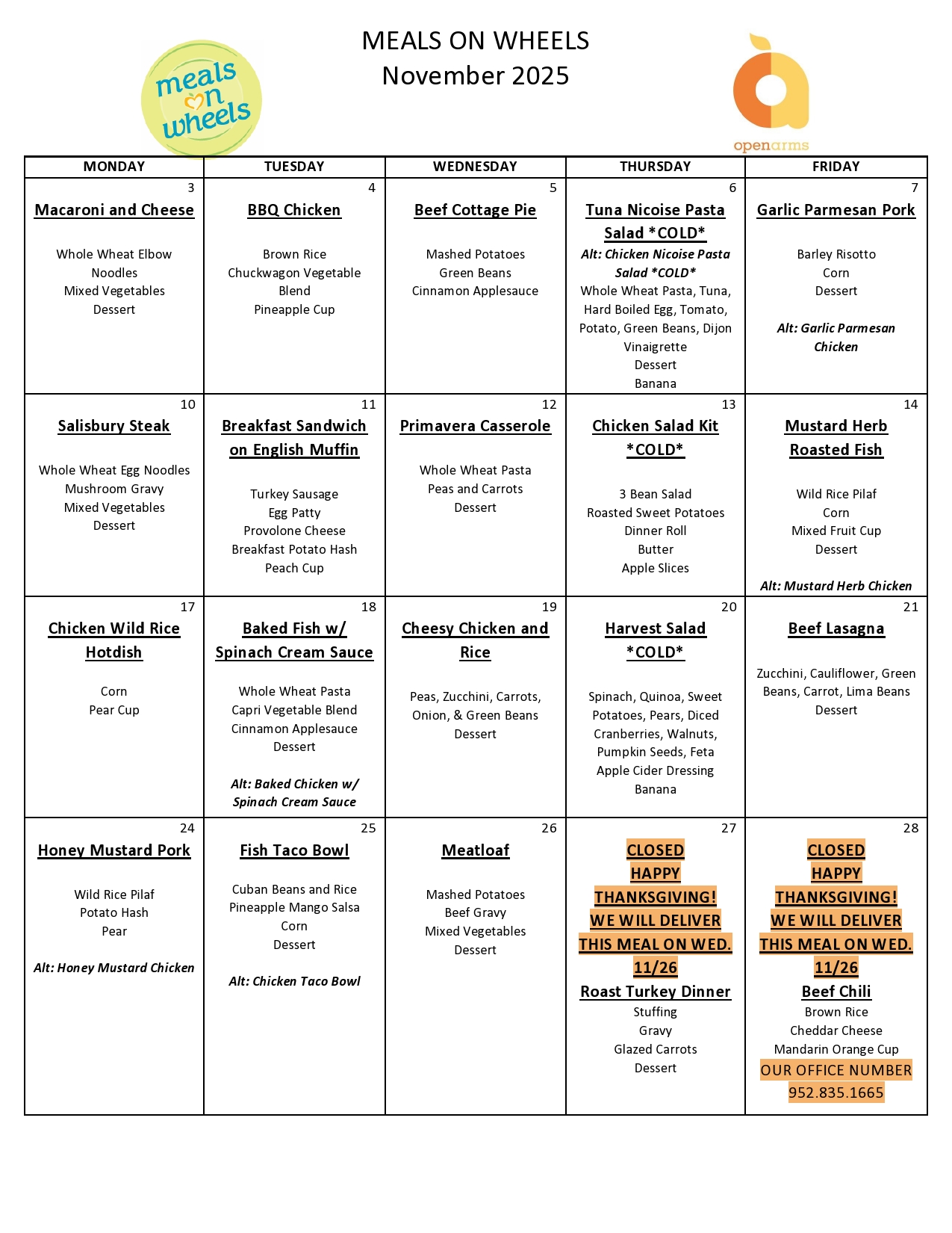 Bloomington – Eden Prairie Meals On Wheels is a non-profit organization that delivers low-cost, hot, nutritious meals during the noon hour in the cities of Bloomington and Eden Prairie. Our clients are elderly, ill or disabled persons who are unable to shop or prepare meals for themselves. Meals are delivered by volunteers whose friendly visit plays a vital role in allowing clients to stay independent and in their homes.